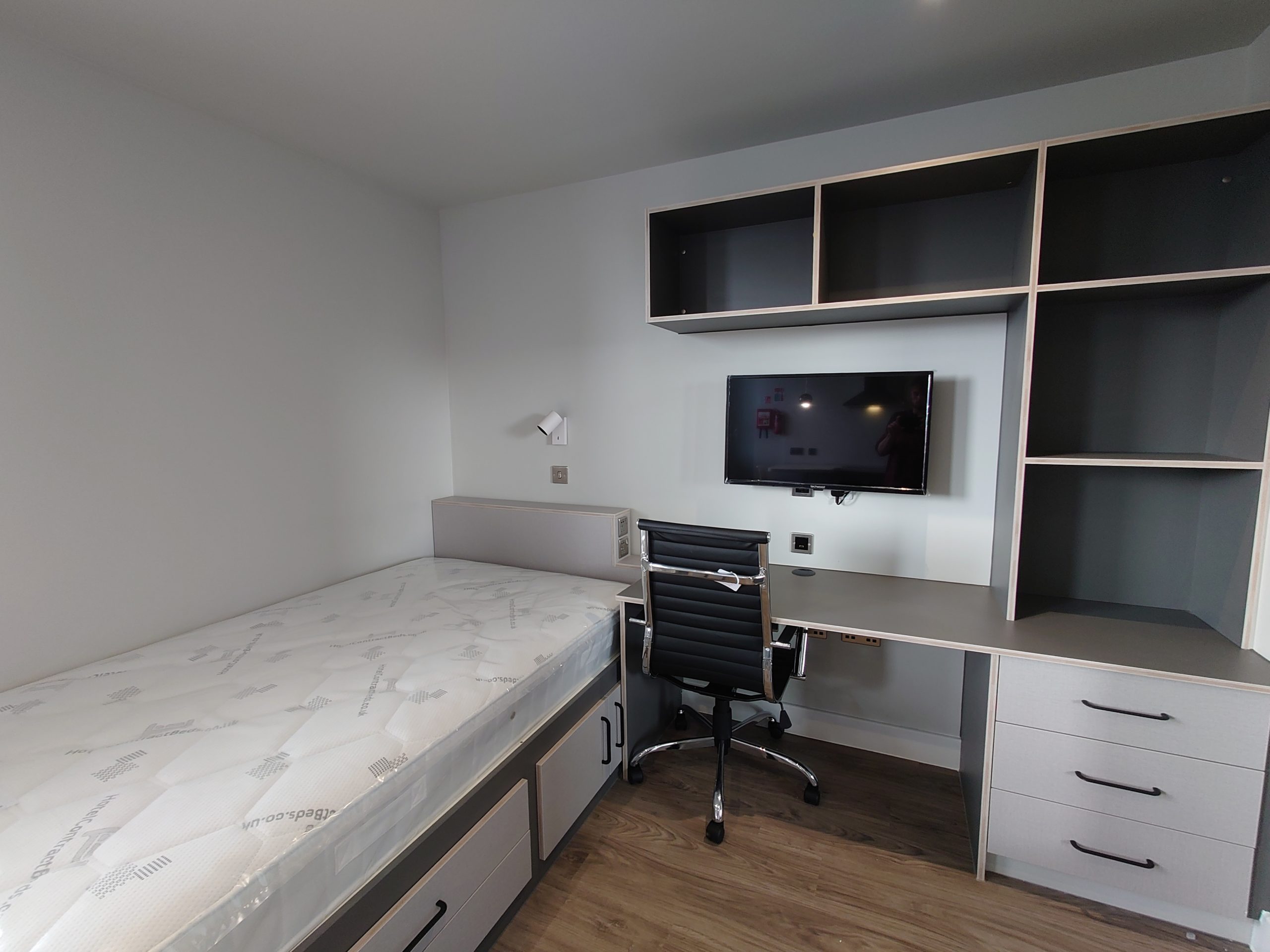 Studios are very high spec including dish washer, microwave, under bed storage, large desk, plenty of shelves, bean bag chairs, TV, super fast Internet